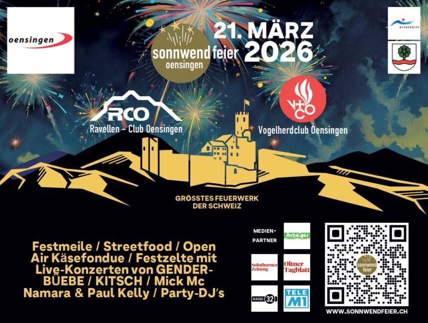 Mit dem erweiterten Konzept bleibt das Feuerwerk Herzstück der Veranstaltung, während das Rahmenprogramm neue Akzente setzt und die Sonnwendfeier als regionales Grossereignis weiter stärkt. Der Eintritt beträgt 25 Franken, für Kinder bis und mit 15 Jahren ist der Eintritt frei. Tickets erhalten Sie im Vorverkauf auf Seetickets.ch, am Schalter der OEBB Balsthal und bei der Baloise Bank Oensingen (von 9 bis 12 Uhr). Am Anlass können die Tickets direkt auf dem Festgelände bezogen werden. Es wird empfohlen, frühzeitig anzureisen und den öffentlichen Verkehr zu benutzen. Der Bahnhof Oensingen ist fünf Gehminuten vom Festgelände entfernt. Weitere Informationen zu Programm, Anreise und Tickets sind unter www.sonnwendfeier.ch verfügbar.