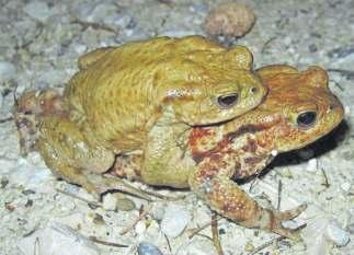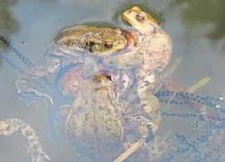 Laichgeschäft oder auf der Rückwanderung aus Erschöpfung. Hans Althaus, der die Beobachtungen zu den Amphibienlaichzügen in der Region Zofingen 1991 – 2006 im Auftrag der IG vernetzte Landschaft Aare-Wiggertal akribisch ausgewertet hat, geht bei den Grasfröschen von einem Geschlechterverhältnis von 1:3 bis 1: 5 aus, während bei den Erdkröten auf ein Weibchen sogar fünf bis sieben Männchen kommen. Entsprechend umkämpft sind die «Logenplätze» auf dem Rücken der Weibchen. Treffen Männchen ein Weibchen an – oft schon weit vor der Ankunft im Gewässer – springen sie auf seinen Rücken und pressen die kräftigen Vorderbeine in seinen Bauch.