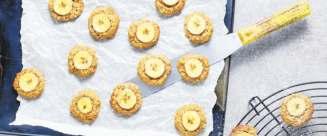 2. Aus der Masse baumnussgrosse Häufchen formen, mit genügend Abstand auf das vorbereitete Blech geben. Beiseitegestellte Banane in Scheiben schneiden, auf die Guetzli legen und leicht andrücken, nochmals