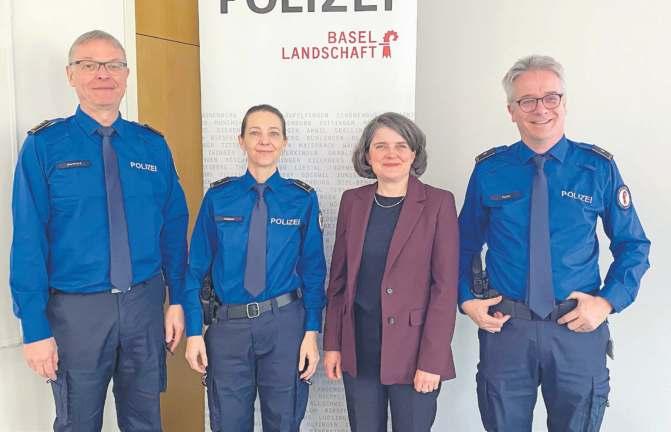 Die Polizeioffiziere (v.l.) Mark Burkhard, Fabienne Holland, Regierungsrätin Kathrin Schweizer, und Christian Egeler, präsentierten am Montag eindrückliche Zahlen.