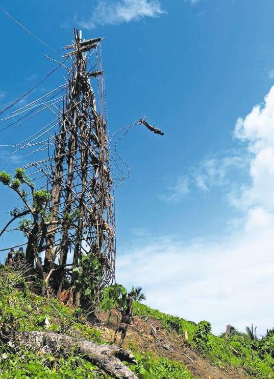 tränk lässt einen ruhiger werden, macht Lippen und Zunge gefühllos Speziell bei diesem Stamm war: Das Getränk wurde auf traditionelle Art hergestellt Das hiess: Die rund zwanzig 16-Jährigen des Stammes kauten die Kava-Pflanze und spien die Mischung aus Spucke und Saft in einen Kessel. Danach wurde das Getränk in einer Kokosnussschale angeboten Ich konnte schlecht Nein sagen Aber ein mulmiges Gefühl beschlich mich schon. Ich muss allerdings sagen: Hätte ich nicht gewusst, wie er produziert wurde, wäre es mein bester Kava überhaupt gewesen. Ich setzte meine Reise fort, wollte nach Pentecost, einer anderen Insel Vanuatus Ich wusste, dass dort die Land Divers heimisch sind. Das sind Angehörige jenes Volkes, das als Erfinder des modernen Bungee-Jumpings gilt Als Dank für eine gute Ernte und wohl auch als Fruchtbarkeitsritual errichten sie einmal im Jahr einen bis zu 35 Meter hohen