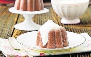 • Puddinge mit einem spitzen Messer vom Förmchenrand lösen, kurz ins heisse Wasser tauchen, auf Teller stürzen. Mit einem Klacks Schlagrahm garnieren.