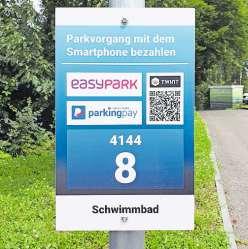 Mit zusätzlichen Schildern wird auf die zentrale Parkuhr am Schwimmbadeingang hingewiesen: