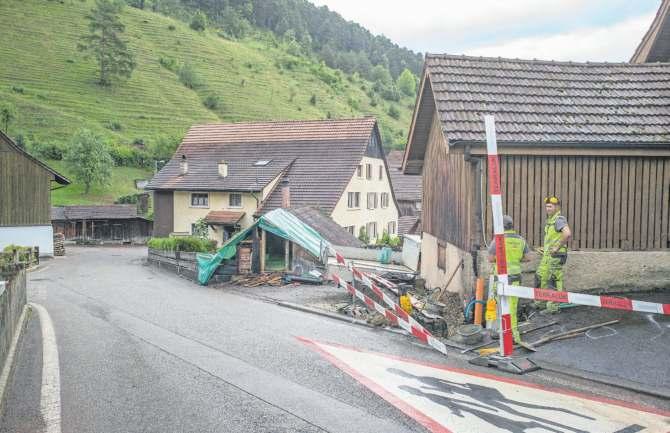 Flugunfall Dittingen: Am Tag danach an der Unfallstelle in Dittingen an der Hauptstrasse beim zerstörten Schopf. FOTO: ARCHIV