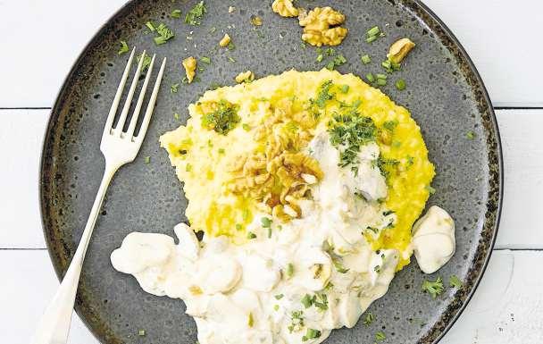 • Polenta mit Pilzragout anrichten, Baumnüs se und Kräuter darüber streuen