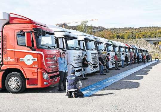 H2-MOBILITÄT Letzten Sams tag, 15 Oktober, trafen sich zwanzig Lastwagen, die mit Wasserstoff angetrieben sind, um gemeinsam den fünfmil lionsten Kilometer innert zweier Jahre zu fahren.