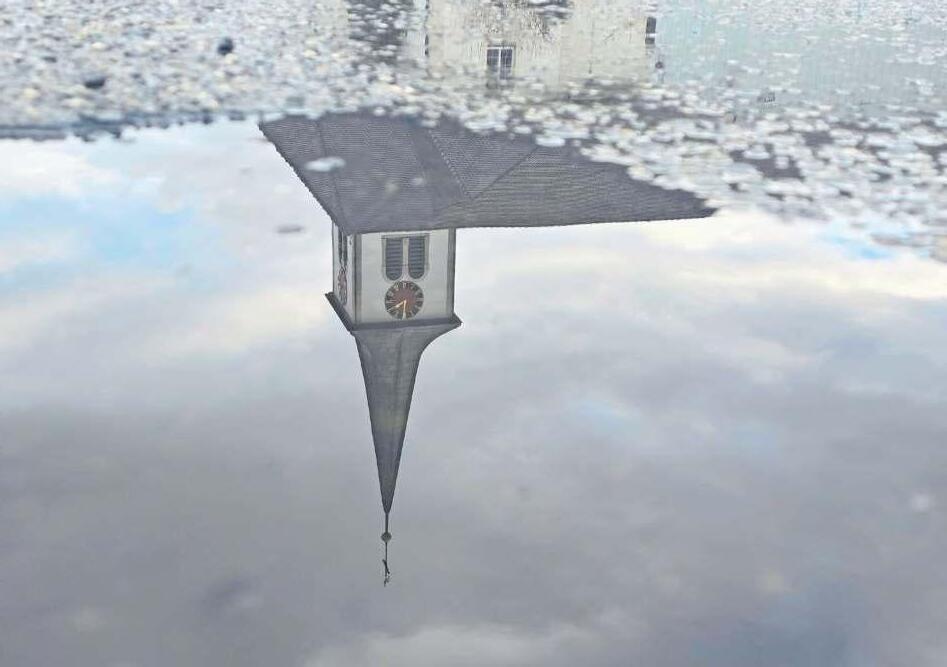 Neuer Blickwinkel: Die Kirche in Erschwil mal anders rum, genau um 10 Uhr, gespiegelt in einer Pfütze. FOTO: ANJA HÄNER ERSCHWIL