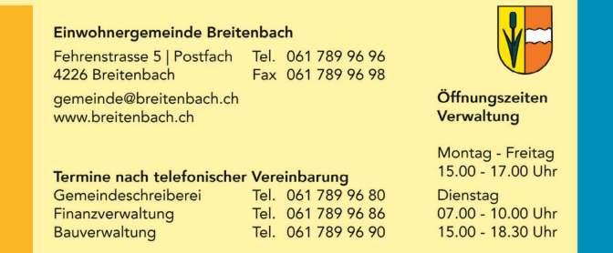 Für allgemeine Auskünfte stehen Ihnen Gemeindepräsidentin Doris Weisskopf, Telefon 078 668 41 08, und für fachliche Fragen Finanzverwalterin Anita Müller, Telefon 061 725 10 14, gerne zur Verfügung.