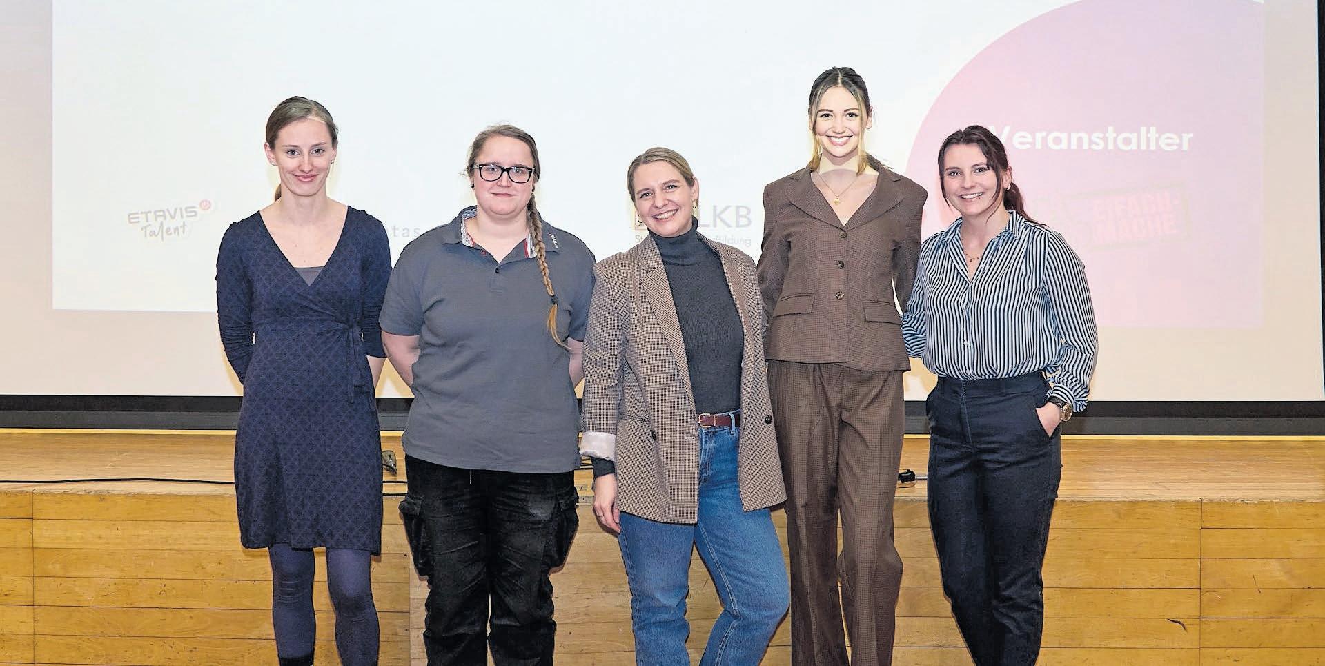 Auf dem Podium: (v. l.) Salome Steiner, Lernende Elektroinstallateurin im 2. Lehrjahr, Michelle Fellmann, gelernte Elektroinstallateurin, Verena Gebler, HR-Expertin, Lisa Berchten, Moderatorin und Robin Steffen, gelernte Polymechanikerin. FOTO: PHOTO-HERZMANN