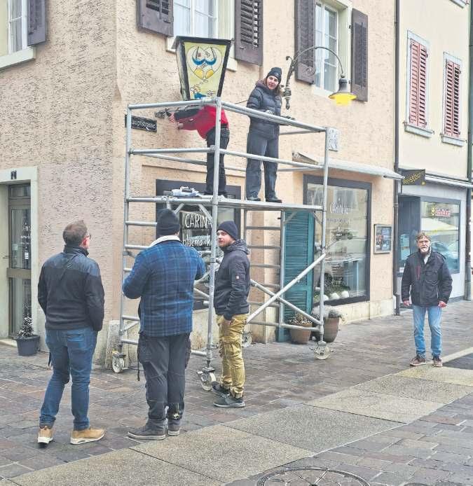 Beim Montieren: Die Fasnachtslaternen erleuchten wieder das Stedtli. FOTO: MELANIE BRÊCHET