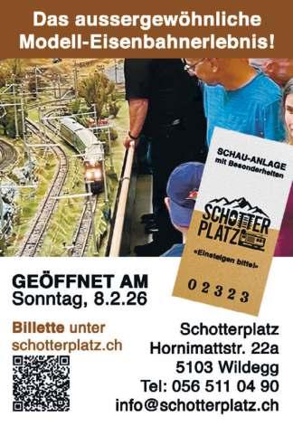 10 bis 17 Uhr: Publikumstag Schotterplatz. Eine faszinierende Modelleisenbahnanlage mit Schweizer Landschaften, vielen Details und einem gemütlichen Bistro. Begrenzte Besucherzahl, Reservation empfohlen.