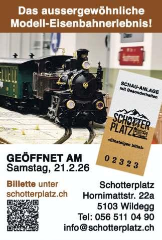 Möriken-Wildegg, Schotterplatz 10 bis 17 Uhr: Publikumstag Schotterplatz. Faszinierende ModellEisenbahnanlage mit Schweizer Landschaften, vielen Details und einem gemütlichen Bistro. Begrenzte Besucherzahl, Reservation empfohlen.