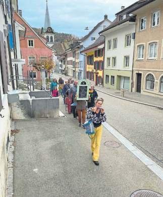 Peric. Die leuchtenden Äpfel von den Kindergartenkinder aus dem Fraumattschulhaus. Zwischenhalt beim Quartierladen: Die Kinder singen ein Lied. 17. Lampenberger Wald-