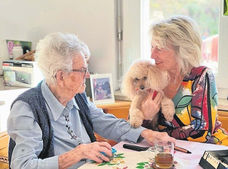 «Für mich ist es einfach das Schönste, sie lachen zu sehen», sagt Sylvie Neuhaus. Sie engagiert sich freiwillig im PalliativProgramm «Begleiten» des Roten Kreuz Baselland und der Ökumenischen Koordinationsstelle Palliative Care Baselland. Seit über einem Jahr besucht sie die 98-jährige Ingeborg Alt – eine Begegnung, die beiden guttut. Ingeborg Alt lebt allein, ihr Mann ist vor zehn Jahren verstorben, Kinder hat sie keine. Wegen einer starken Hörbeeinträchtigung kann sie Gespräche nur von den Lippen ablesen. Wenn Sylvie Neuhaus mit Pudelhündin Milly zu Besuch kommt, füllt sich die Wohnung mit Leben. Gemeinsam trinken sie Kaffee, spielen Rummikub und geniessen die gemeinsame Zeit. «Die Treffen helfen