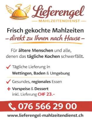 Der «Lieferengel»-Mahlzeitendienst bietet frisch gekochte Mahlzeiten für Menschen in Baden, Wettingen und der umliegenden Region. Das Angebot richtet sich an Seniorinnen und Senioren, berufstätige Personen sowie an alle, denen das tägliche Kochen im Alltag schwerfällt. Die Auslieferung der Mahlzeiten erfolgt persönlich durch die Söhne der Gründerin Stephanie Iten. Dadurch entsteht ein persönlicher Kontakt zu den Kundinnen und Kunden sowie ein vertrauensvoller Service in der Region. Alle Infos unter: www.lieferengel-mahlzeitendienst.ch. (zVg)