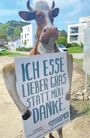 beplakat, das aufs Thema Littering aufmerksam macht. «Abfall tötet Tiere» steht in grosser Schrift darunter: «Gerät eine Alu-Büchse in eine Mähmaschine, verwandelt sie sich in viele kleine, messerscharfe Klingen. Diese gelangen mit dem Gras oder Heu unbemerkt ins Futter der Kühe. Die verheerende Folge: innere Verletzungen, die zu einem qualvollen Tod führen können.»