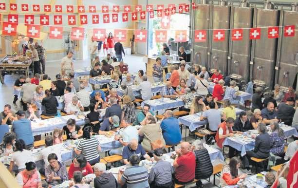 1.AugustBrunch bei Steimer Weinbau Erstmals lud Steimer Weinbau zum 1.-August-Bunch in die eigene Weinbauhalle an der Fohrhölzlistrasse 3 ein – und der Anlass übertraf alle Erwartungen. 200 Gäste genossen ein Brunchbuffet in besonderem Ambiente. Die Veranstaltung war bereits im Vorfeld ausverkauft. Trotz unsicherer Wetterlage konnte der Brunch wie geplant durchgeführt werden – alle Sitzplätze befanden sich in der dekorierten Halle, sodass die Gäste geschützt und gemütlich feiern konnten. Bereits ab 7 Uhr waren zahlreiche Helferinnen und Helfer im Einsatz. Mit grossem Engagement und viel Herzblut wurden sämtliche Fleisch- und Käseplatten von Hand angerichtet, Brotkörbe vorbereitet, Speisen gekocht und die Halle einladend geschmückt. Ab 9 Uhr durften sich die