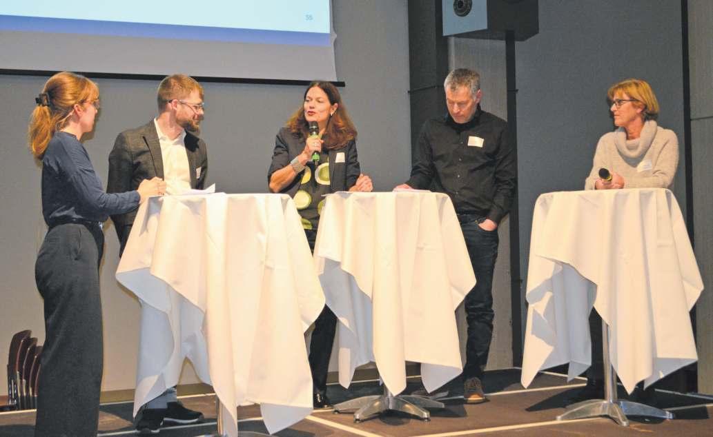 Podium Moderatorin Martina Liebert (l.), Alain Burger, Tanja Temel, Markus Zoller und
