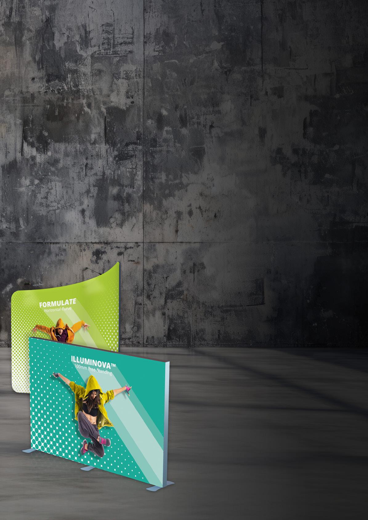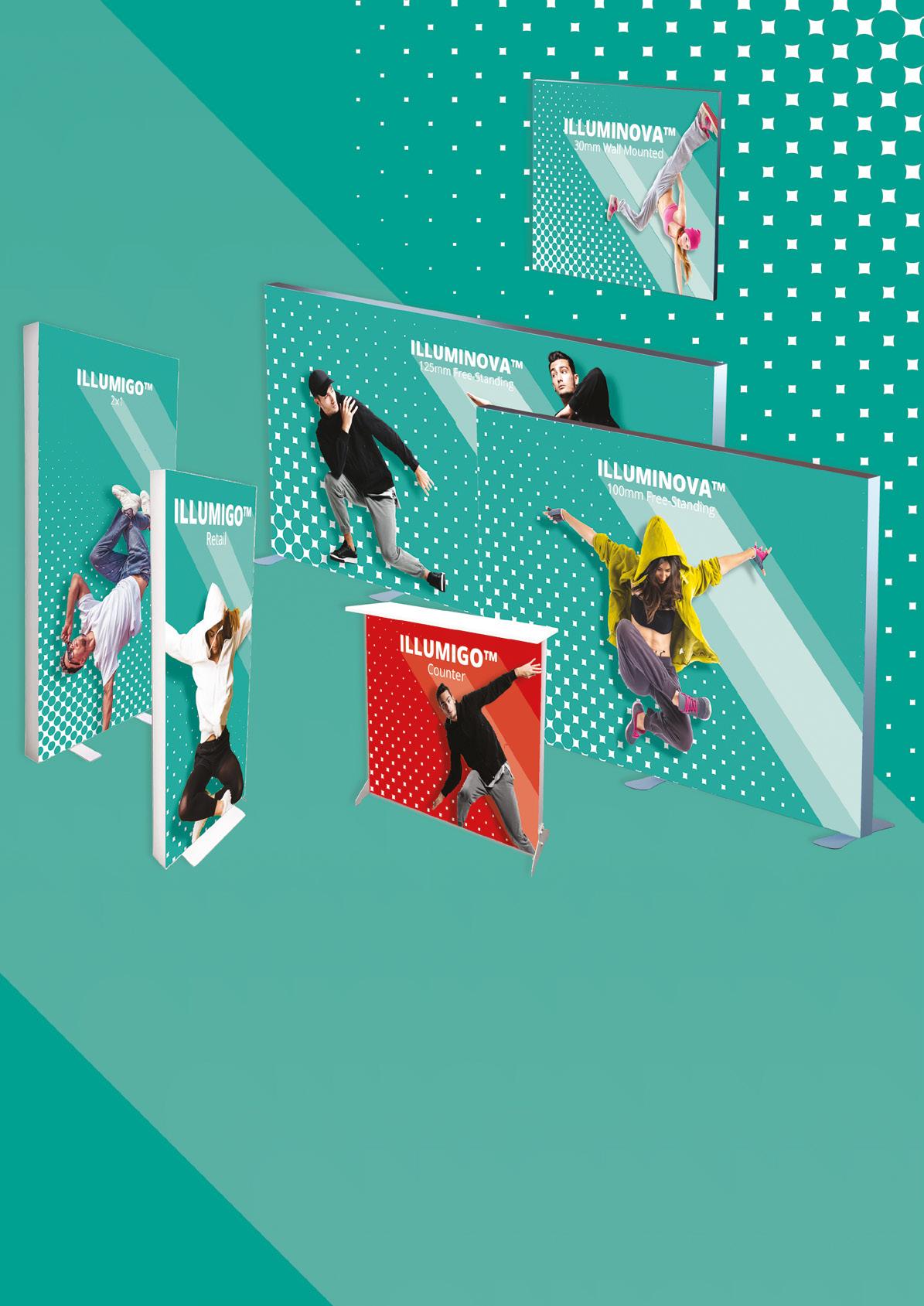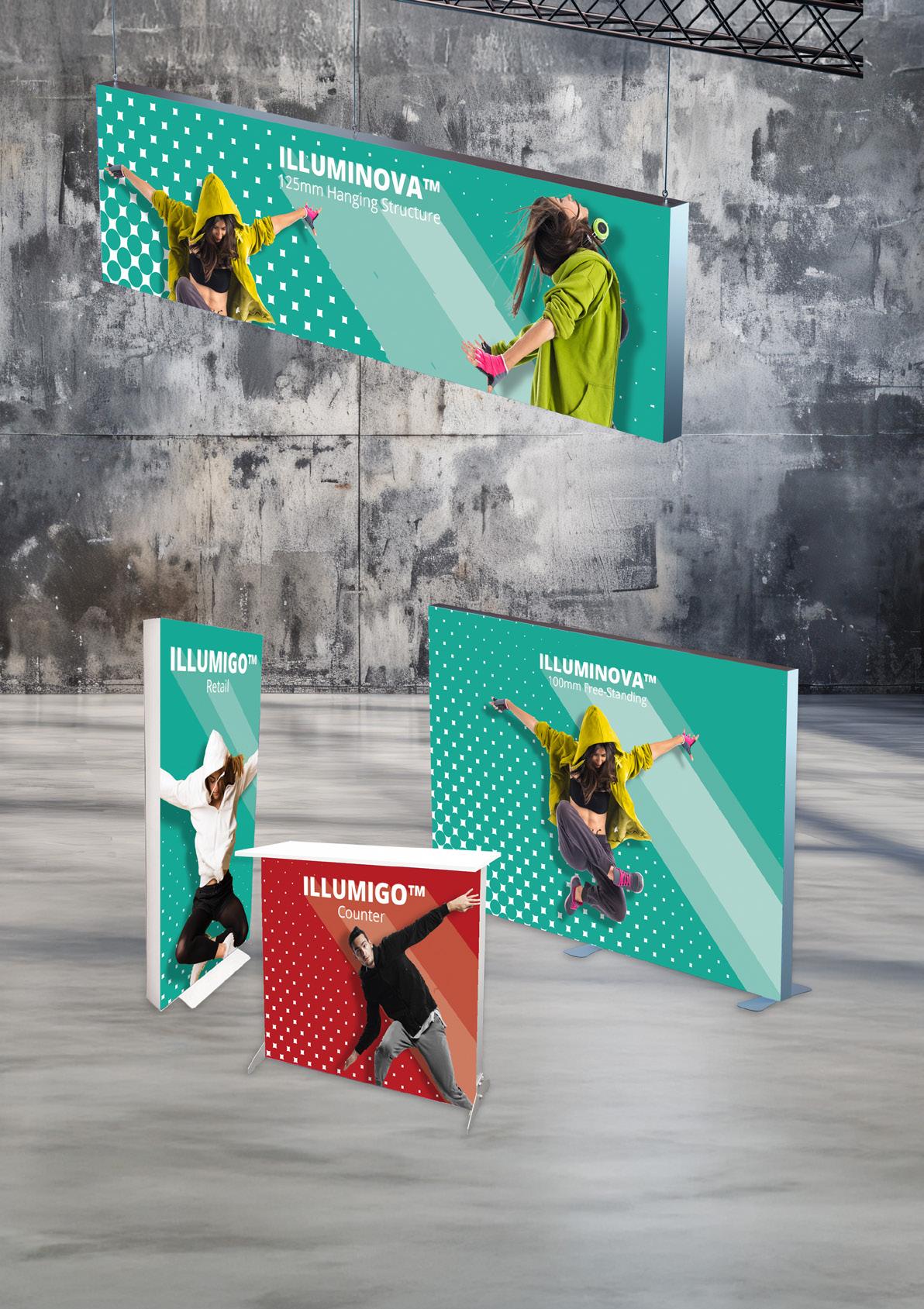 Nous vous proposons deux gammes de caissons lumineux pour tissu tendu. La gamme Illuminova™ , composée de nombreux profilés s’adaptant à tous vos besoins, est disponible en formats standard ou sur-mesure. La gamme Illumigo™, la solution Plug and Play rapide à monter, est une collection de 5 modèles allant du comptoir au mur d’image pour donner vie à vos espaces de vente.