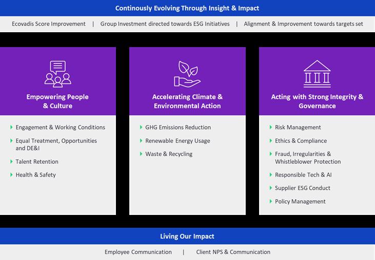 We have defined a clear sustainability vision supported by key metrics and measures that reflect Azets’ purpose and our pathway pillars, ensuring they remain fit for purpose across the multiple jurisdictions in which we and our clients operate. The strategy outlines our core sustainability pillars (highlighted in purple), which represent the areas most material to our business. We are committed to continually driving progress against these themes, monitoring performance and always striving for improvement.