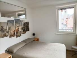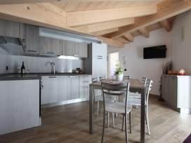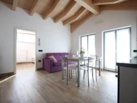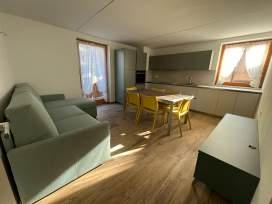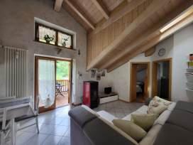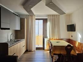 The Arnica attic is a bright wooden apartment with 2 bedrooms, living room with equipped kitchen, bathroom, large windows and parking space.