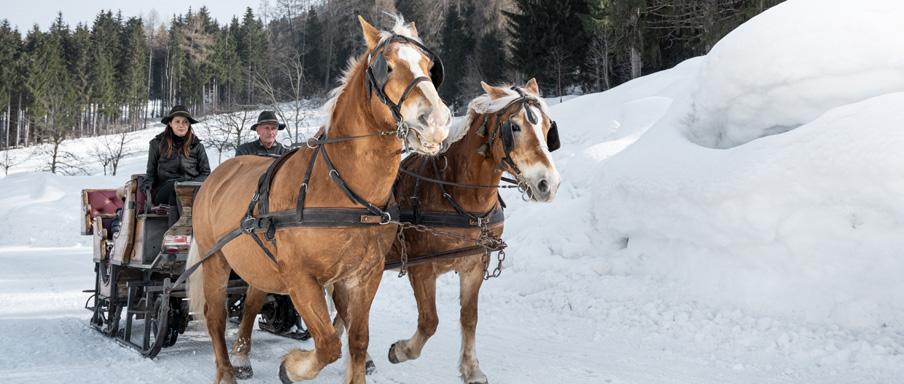 Snow, clogs and bells! Just like in a fairy tale, get into the carriage and let yourself be transported by Jenny and Gelo, the inseparable pair of blond Haflinger horses. We offer you an evening rediscovering ancient atmospheres. Through the forest and countryside in a carriage to Pellizzano, and on the way back an aperitif based on km0 products.