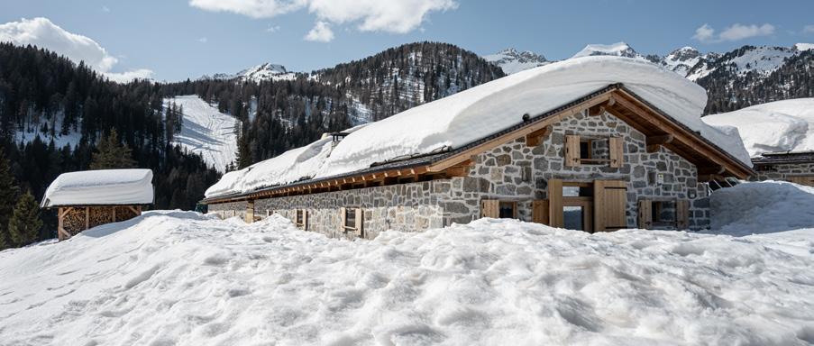 This itinerary crosses the snow-covered pastures of Malga Dimaro from which you can enjoy a striking view of the Brenta Dolomites, UNESCO World Heritage Site, and then continues into the heart of Madonna di Campiglio Skiarea, where we will enjoy a delicious lunch at the typical «Baita Ciocomiti - Malga Vigo».