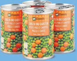 Piselli e carote, piselli o purea di mele, M-Classic per es. piselli e carote, fini, 4 x 260 g, 5.10 invece di 6.80, (100 g = 0.49)
