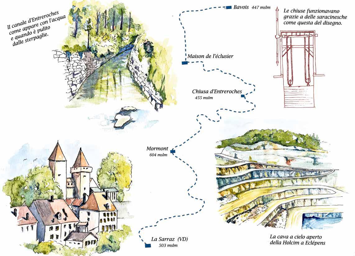 europeo s’interrompe lì. La via d’acqua sarà comunque utilizzata fino al 1829 per il trasporto di sale, grano, formaggio e vino vodese. A poco a poco, il canale d’Entreroches perde importanza, qua e là è interrotto da frane, i muri si sgretolano, il potenziamento delle strade e l’arrivo della ferrovia gli danno il colpo di grazia e, per finire, viene dimenticato. Alcune vestigia più o meno evidenti di questo progetto un po’ folle esistono però ancora nella campagna vodese. E così, eccomi qui, alla ricerca di questi muti testimoni di un’epoca turbolenta e oscura, animata al contempo da una nuova consapevolezza e dalla