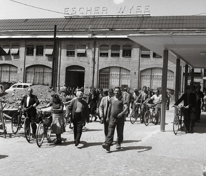 Fine del turno alla Escher Wyss di Zurigo: la forza lavoro era prevalentemente maschile.