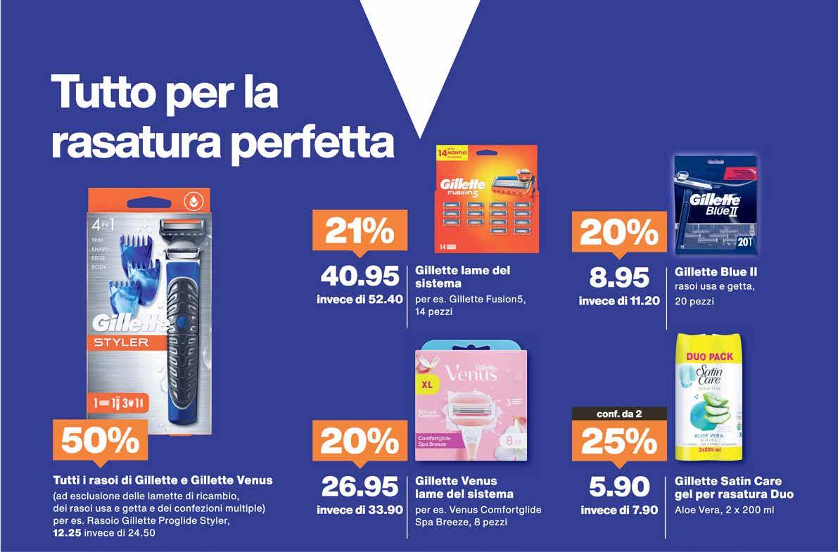 16 Con un pizzico di aloe vera 5.80 Rasoio usa e getta Gillette Simply Venus in conf. speciale, 8 pezzi, (1 pz. = 0.73) Hit Rasoi Gillette e Gillette Venus (esclusi lame di ricambio, rasoi usa e getta e conf. multiple), per es. Venus Deluxe Smooth Sensitive, il pezzo, 9.75 invece di 19.50, (1 pz. = 9.75) 50% Assorbenti o salvaslip, Always Ultra in conf. multiple o speciali, per es. Normal, 2 x 76 pezzi, 8.75 invece di 10.30, (1 pz. = 0.06) conf. da 2 15% Tutto l'assortimento Manhattan per es. mascara waterproof Volcano, il pezzo, 7.65 invece di 10.90 a partire da 2 pezzi 30% 5.90 Tampax Super, Super Plus o Regular, in conf. speciale, 30 pezzi, (1 pz. = 0.20) Hit 8.95 invece di 11.20 Rasoi usa e getta Gillette Blue II in conf. speciale, 20 pezzi, (1 pz. = 0.45) 20% Tutto l'assortimento M-Plast (confezioni da viaggio escluse), per es. cerotti Comfort, 10 pezzi, 2.25 invece di 2.95 a partire da 2 pezzi 25%
