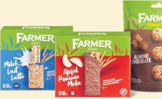 Tutte le barrette ai cereali e gli snack, Farmer per es. barrette ai cereali al cioccolato e alla mela, 288 g, 3.22 invece di 4.60, (100 g = 1.12) a partire da 3 pezzi 30%