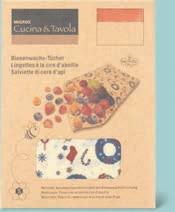 cera d'api sono un'alternativa riutilizzabile alla pellicola salvafreschezza. Consentono di coprire contenitori o confezionare generi alimen tari come panini o frutta a pezzi. Lo strato di cera repellente può sciogliersi a contatto con il calore, è pertanto consigliato pulire i panni sotto acqua fredda, se necessario con un po' di detersivo per piatti, e lasciarli asciugare.