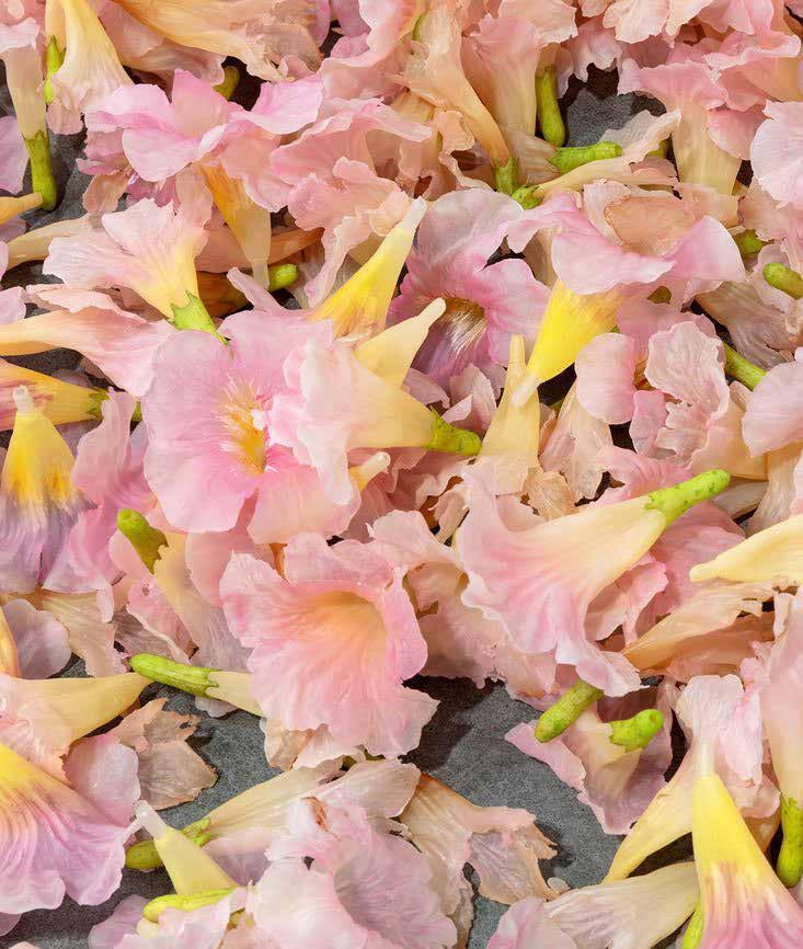 >>> Graft (Tabebuia heterophylla), 2021 Igualmente dispersa por el espacio expositivo se muestra la obra Graft (2021), una instalación en la que miles de flores fundidas en cloruro de polivinilo reciclado reproducen las flores del árbol tabebuia como si un viento extraño las hubiera esparcido por el suelo. Los pétalos pintados a mano de este árbol autóctono del Caribe se presentan en diversos grados de descomposición, desde los recién caídos hasta los marchitos y marrones. Graft alude a los cambios medioambientales que están surgiendo con motivo de los efectos entrelazados de la explotación colonial y el cambio climático. La insólita presencia de flores de árboles tropicales creadas con un material de origen petroquímico representa un potente presagio de las inconmensurables pérdidas que avanzan sin cesar tras siglos de saqueo colonial.