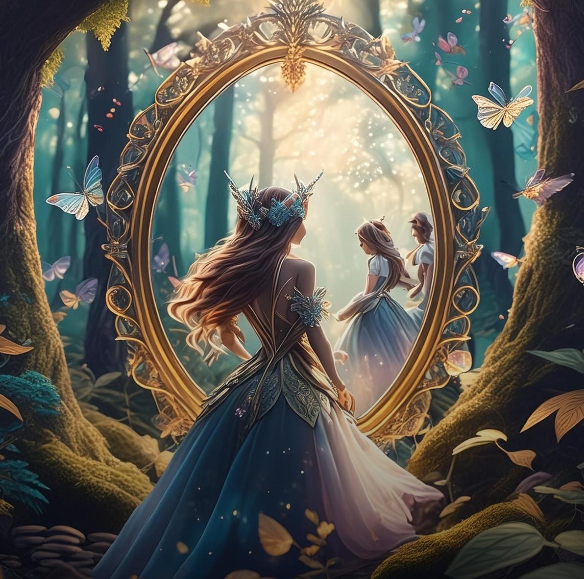 Con curiosidad, limpió la superficie del espejo y se encontró con su reflejo, pero algo era diferente esta vez. El reflejo parecía vibrar con energía mágica, y de repente, una puerta de luz se abrió en el espejo, invitándola a adentrarse en su interio