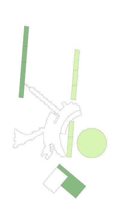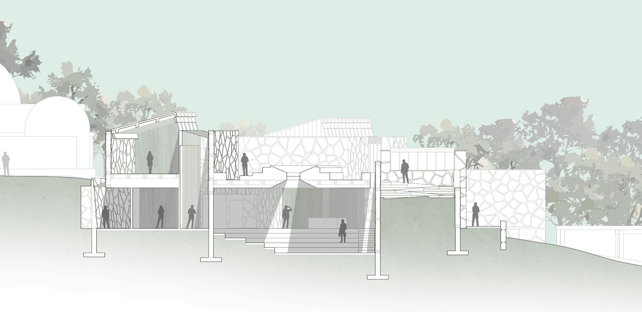 Inspired by the natural quality of New England’s stone walls, the building’s form meanders as it slopes up its site, with walls splitting off to form enclosed spaces. These coves are sunken down to ground level, and circulation between them moves underneath the hill, preserving public access through the site.