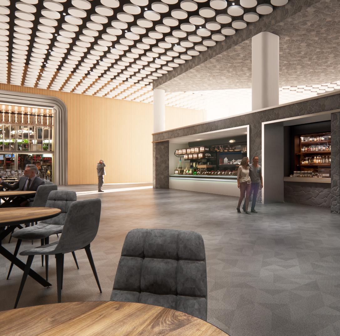 My work culminated in the design of a dining hall scheme for the permanent bus terminal, to be built in phase 2. The dining hall is designed to suit the needs of commuters who need to grab a quick bite to eat, as well as intercity travelers who have more time to linger. As such, guests navigate multiple paths through the space based on their needs, with a diverse array of food outlets set up in a street market style around them. Program inspiration is derived from the terminal’s proximity to the Paddy’s Market Historical District, while circular ceiling panels are designed to be material-efficient by reusing materials from a temporary bus terminal headhouse.