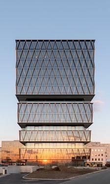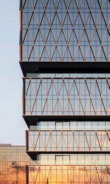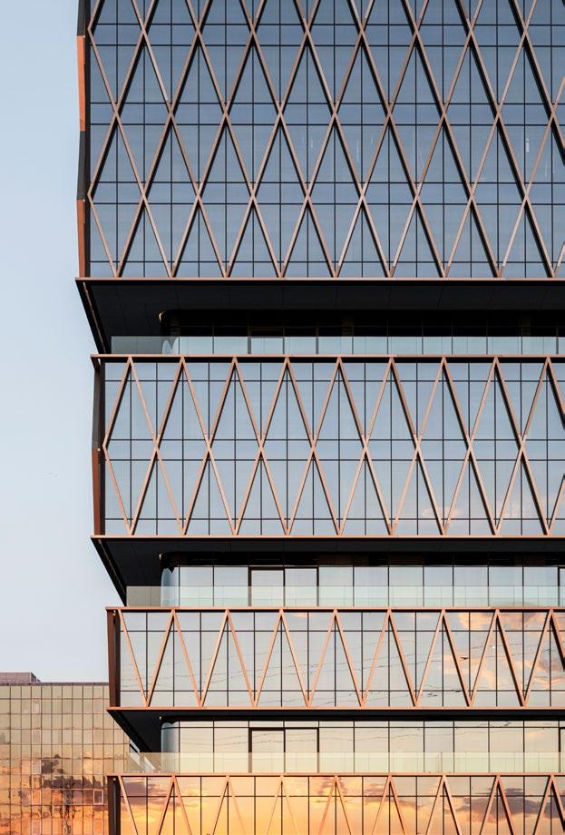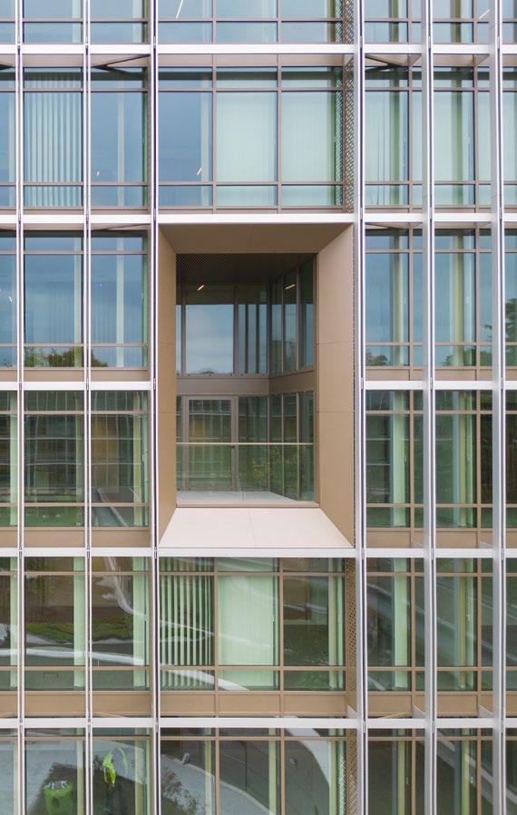 Over de glasgevels is vervolgens een tweede huid getrokken van diagonale lamellen in brons geanodiseerd aluminium. Samen met de uitgesproken volumewerking geven ze het gebouw een sculpturale kwaliteit die balanceert tussen statigheid en dynamiek. Van ver oogt het eerder robuust en abstract, maar hoe dichter je komt, hoe meer subtiliteit, verfijning en detaillering je ervaart.