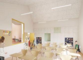 Het atrium vormt het hart van de school. Het is een echte speelzone met ruimte voor beweging en ontspanning. De school wordt verder opgedeeld in verschillende zones die de leerlingen een gevoel van kleinschaligheid en geborgenheid geven. Het plan is open, modulair en flexibel opdeelbaar
