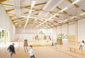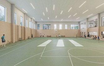Structurele elementen gaan naadloos op in de strakke bouwschil. Ook de stalen dakliggers zitten verborgen in het dakpakket, in de nok wordt een driehoekstructuur toegevoegd om de technieken in te verbergen. Aan de sporthal wordt een technische ruimte ingewerkt in het dak. Met vakwerkstructuren worden zwevende plateaus geïntegreerd. Alle verbindingen werden ingewerkt in muren van amper 20 centimeter dikte.