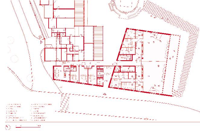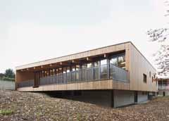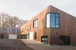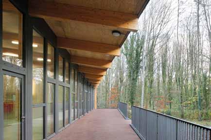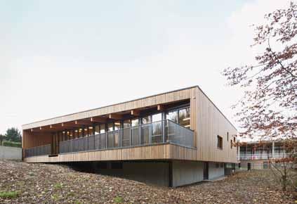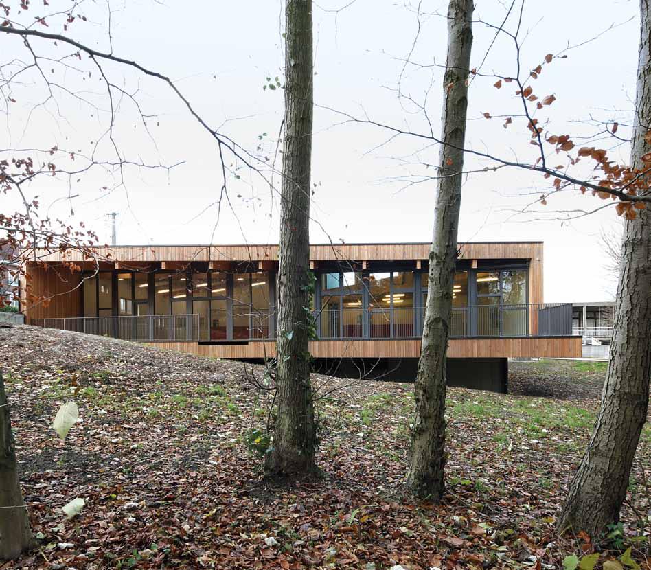 Le bâtiment existant présente un intérêt architectural particulier auquel il était important de tenir compte. Les architectes ont travaillé une volumétrie évoquant celle de l’ancienne aile tout en s’en distinguant. L’usage du bois tant pour la structure que pour le revêtement tranche avec les briques. Les rives de la toiture travaillent en écho avec celles très présentes de l’ancien bâtiment. Le bois, quant à lui, constitue une réponse intéressante à l’environnement végétal très présent.