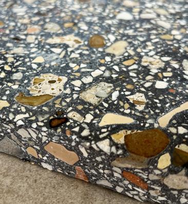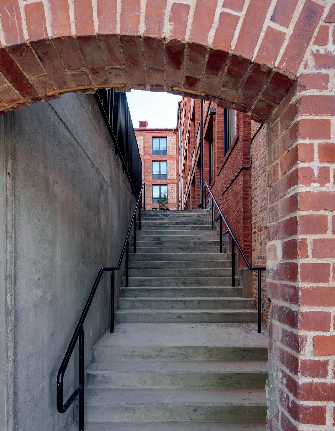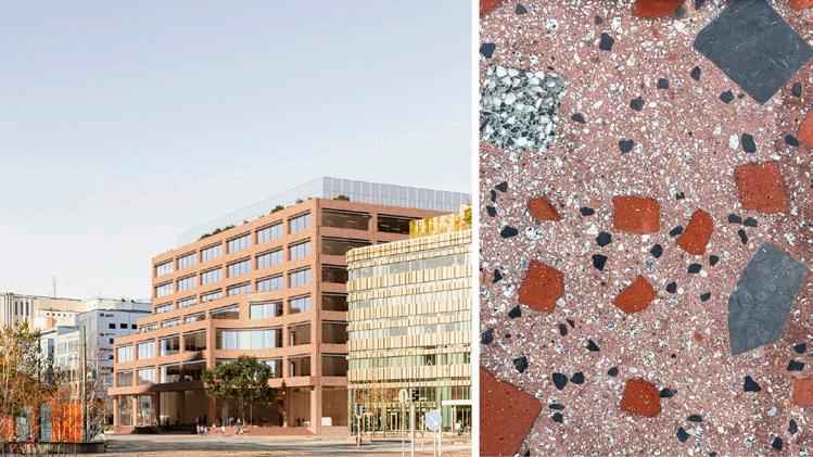 där återbruk och cirkulära materialval genomsyrar både stomme, golv och inredning. Den roströda fasaden går i linje med många av de andra byggnaderna i området. Här finns återbrukat tegel samt krossade delar av terrazzotrappor och kalkstensgolv från den gamla byggnaden ingjutna. Den taktila kompositionen skapar ett varmt och harmoniskt intryck på avstånd och på nära håll träder de unika och livfulla detaljerna fram.
