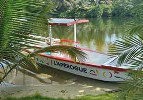Des traversées entre lagune et mer dégénérant en franches parties de rigolade ont donné à cette quinquagénaire dynamique l’envie de posséder sa propre pinasse et de prolonger l’expérience. Et de fait, bien plus qu’une simple balade ou un moyen de relier entre elles les deux rives de la station balnéaire, c’est véritablement une expérience que l’Apérogue propose, loin du faste bling-bling qui caractérise désormais Assinie. Le long des 22 km de lagune baignant les rivages assiniens, vers La Passe et l’embouchure côté quartier France, et jusqu’aux abords des îles Éhotilé, il est désormais possible de louer la pimpante embarcation et d’y établir ses quartiers le temps d’une traversée, d’une heure ou d’une journée, en famille, en amoureux, ou pour une sortie festive entre amis. Un concept très flexible puisqu’il est possible de choisir son itinéraire à la carte et de ramener sa glacière ou de commander un apéritif spécial sur mesure. Et si on se laissait tenter ?
