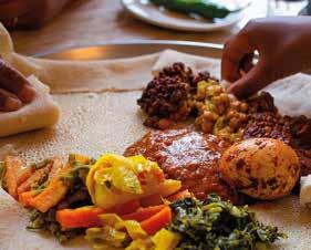 The star of Ethiopian cuisine is injera. At once bread, plate, and utensil, this large spongy pancake made from teff with a slightly tangy flavor accompanies all dishes: doro wat, chicken stew simmered in a spicy berbere sauce (a powerful mix of chili, cardamom, and cinnamon) with onions ; misir wat, lentils flavored with chili and ginger; or tibs, sautéed meat with vegetables and spices. The more daring can try kitfo, raw or lightly seared minced beef seasoned with spiced clarified butter (niter kibbeh).