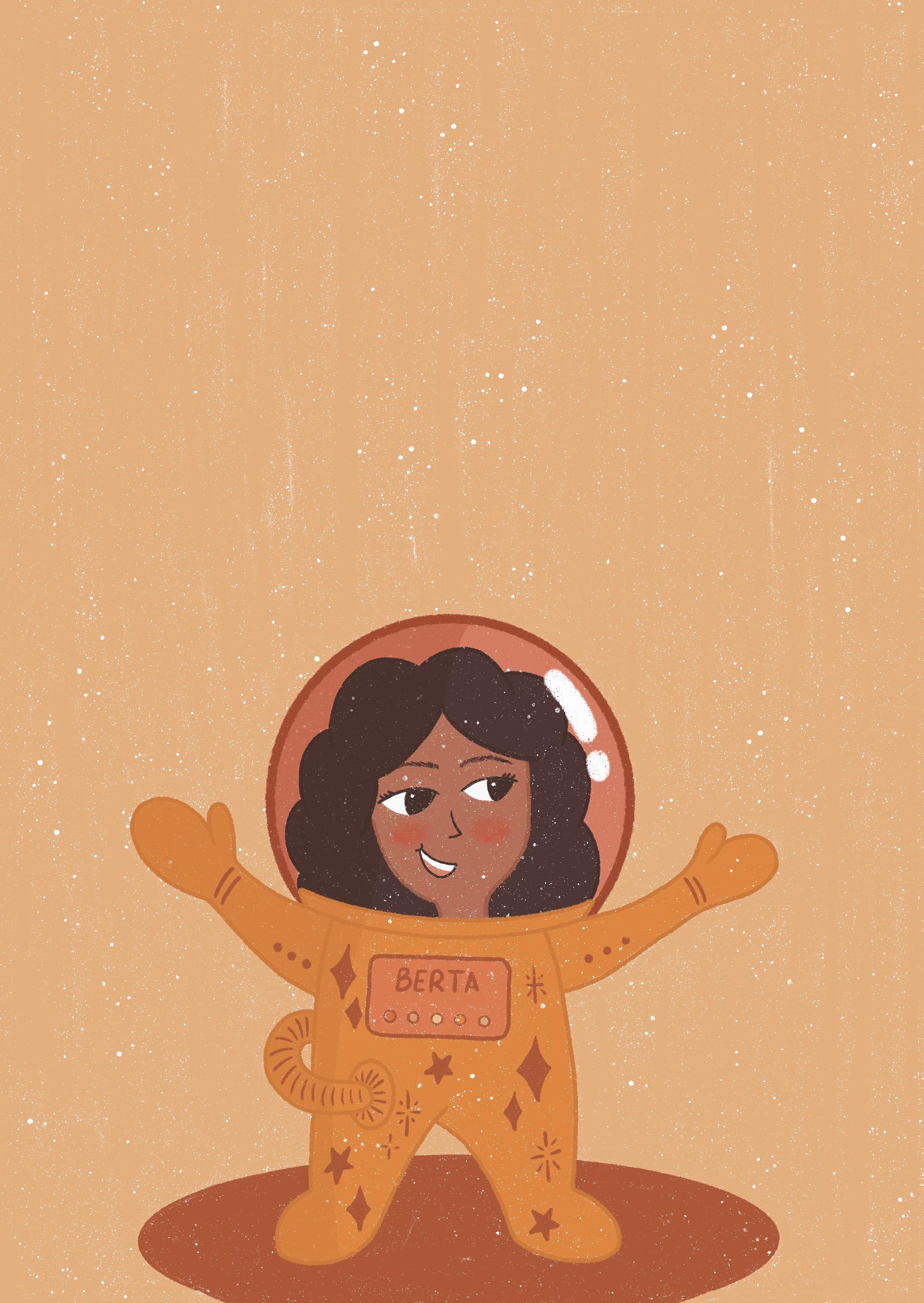 Berta es la hermana mayor. Tiene los ojos negros y brillantes, la piel oscura y el pelo muy rizado. Le gustan los animales salvajes y es la mejor en Matemáticas de su clase. De mayor quiere ser astronauta.