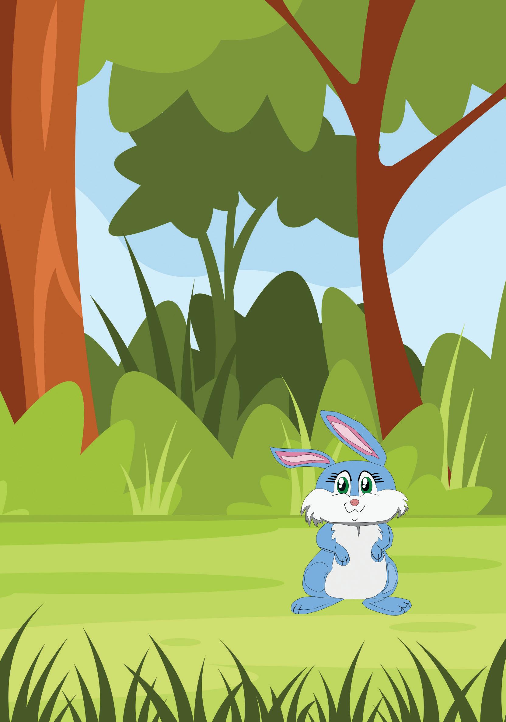 Iba por el bosque cuando de un matorral apareció un pequeño conejito. Era blanco y con una mancha entre los dos ojos de color negra que le llegaba hasta la nariz. El conejito estaba dando vueltas a un árbol y levantaba con sus patitas delanteras las plantas que se encontraba.