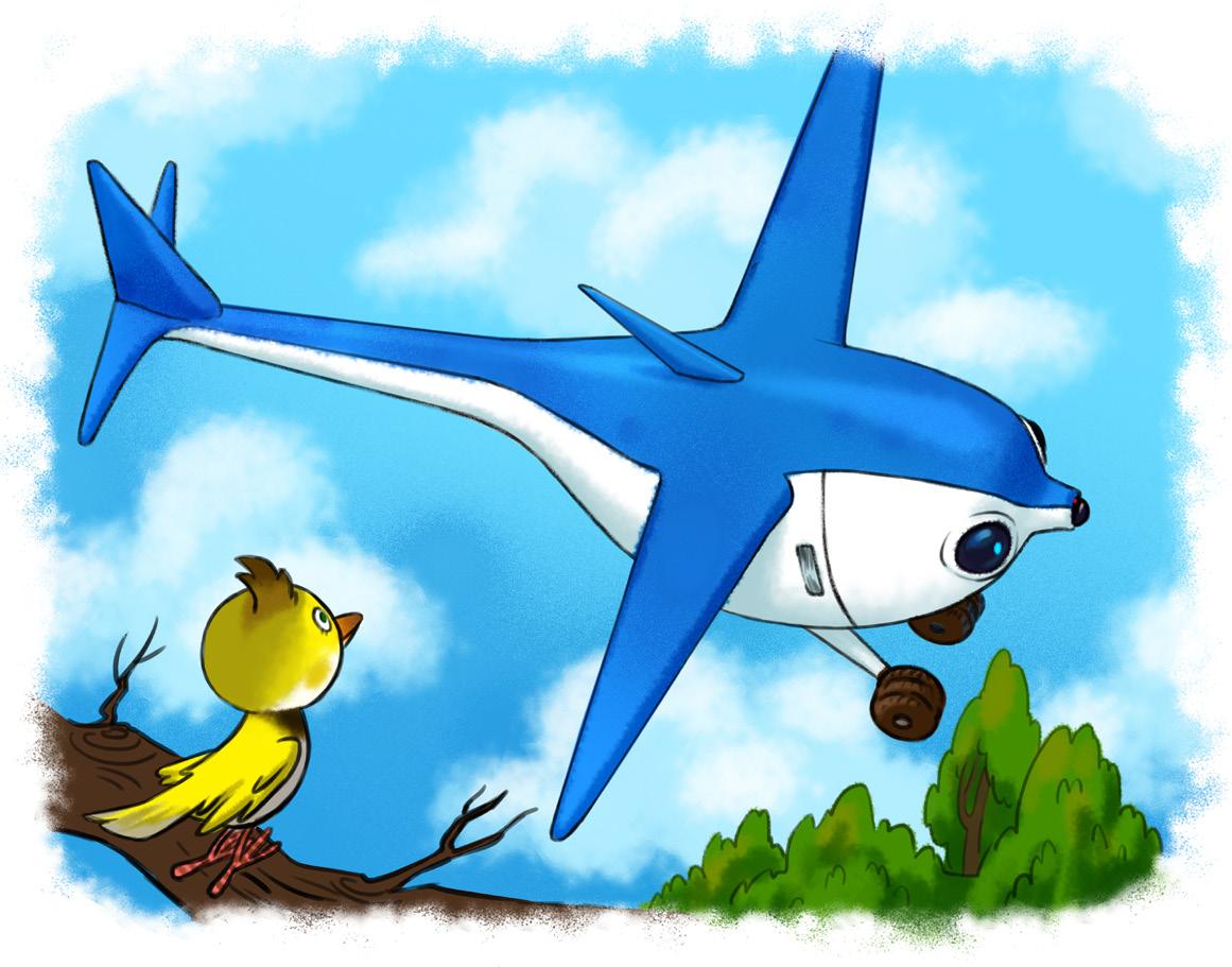 Entonces oyó un zumbido extraño. Alzó la cabeza y vio en el cielo un pájaro insólito. Grande. Sin plumas. Con la espalda azul, la barriga blanca, alas anchas y, en vez de pico, un tubo de cristal que brillaba con una luz roja intermitente.