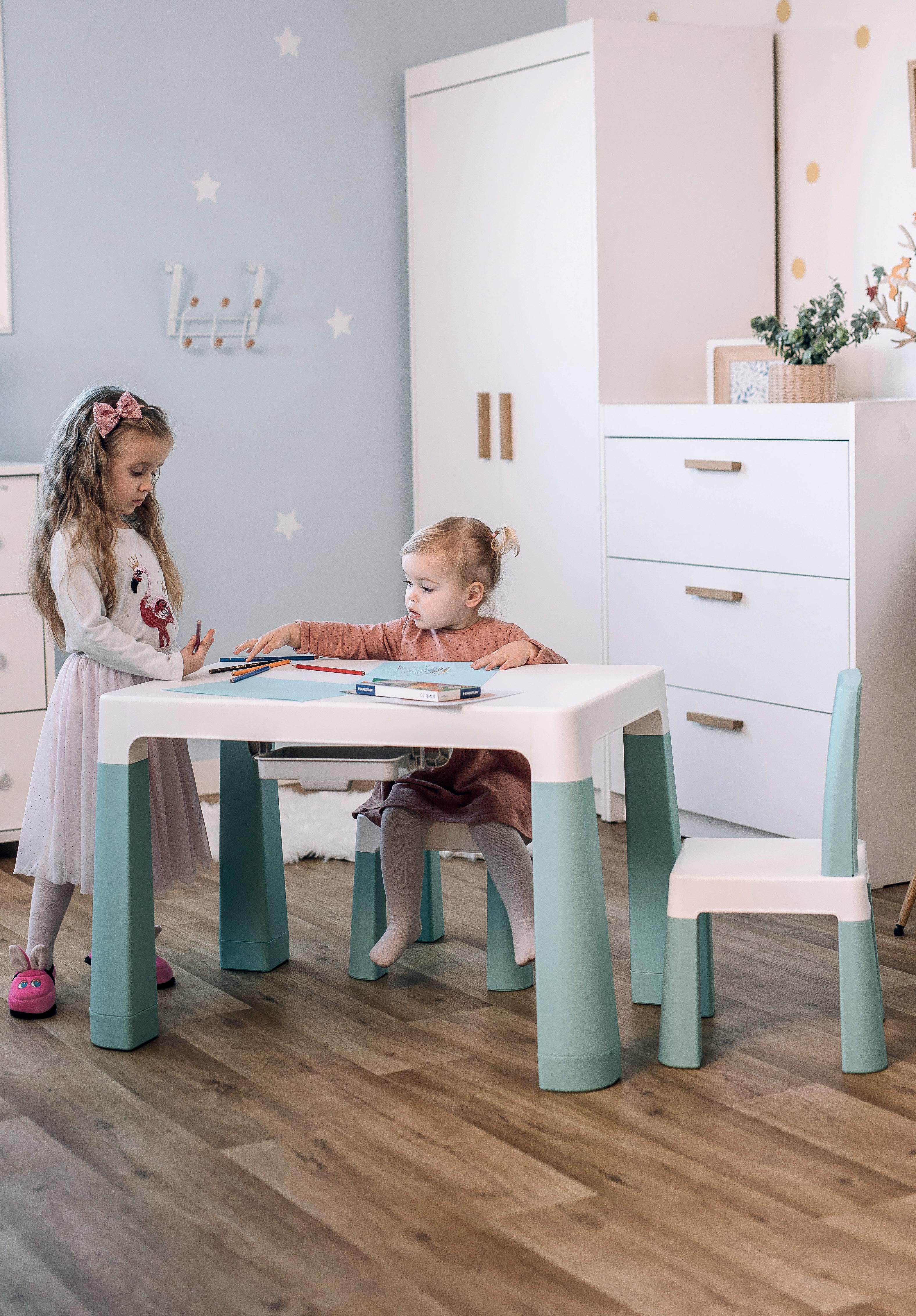 Removable and washable cover Wheels for easier moving Music play tray board with lights Adjustable height in three positions