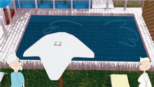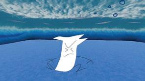La Barra cade in acqua, sbatte il sedere e si sfracella in stile cartone comico in mille pezzettini.