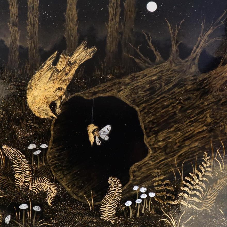 B: The world of conservation and restoration is integral to preserving the art form of japanning. You also depict wildlife and forestry in your works- a world that we are also desperately trying to preserve. Is there an intentional synergy between these ideas in your work?